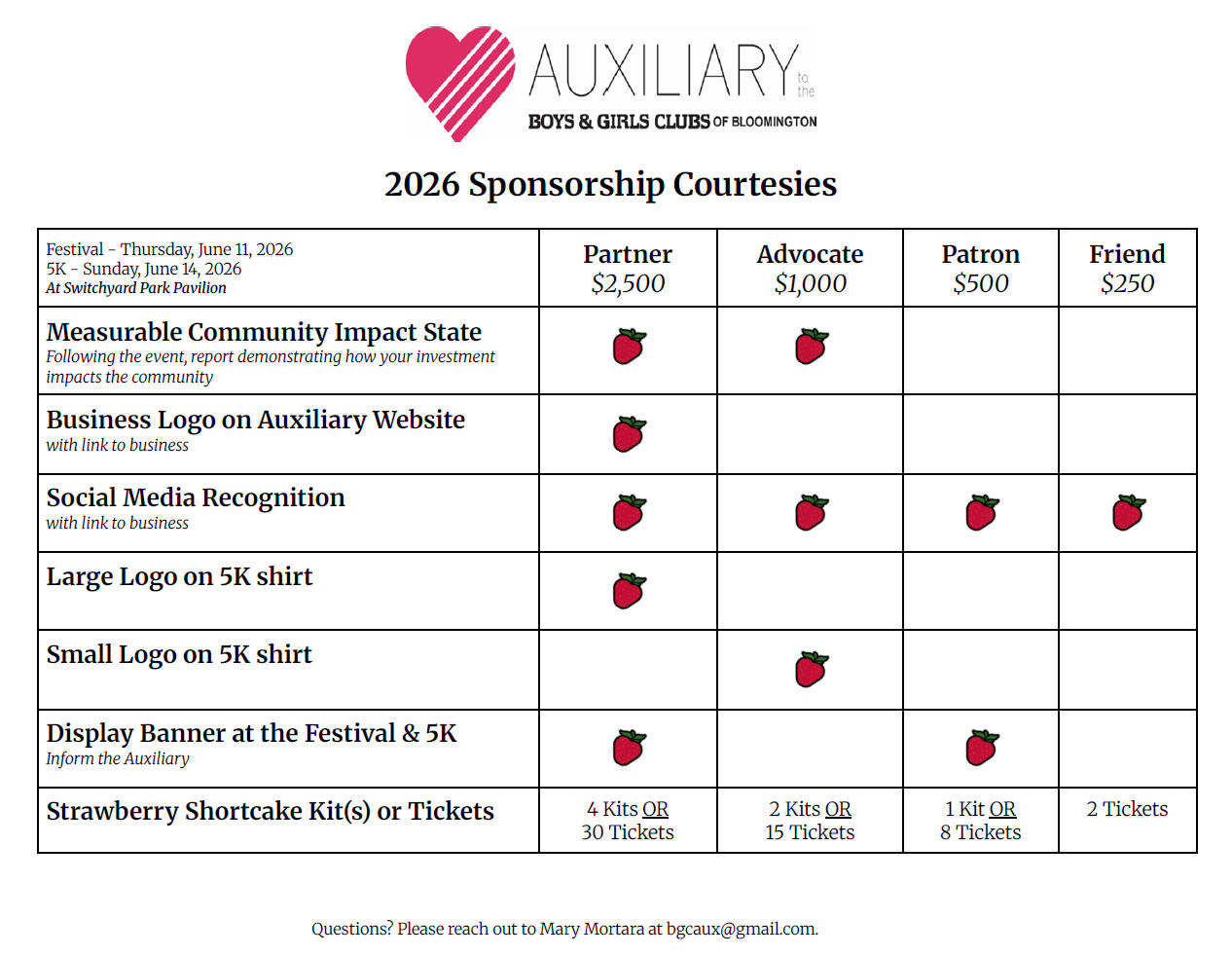 Volunteering their time and resources, members of the Auxiliary host special programs for club members, provide weekly meals at the Steve and Connie Ferguson Crestmont Club, and coordinate various other events and activities for the children.The Auxiliary is the largest unrestricted donor to the Boys & Girls Clubs of Bloomington. Each year, we host the Strawberry Spectacular, which consists of the Strawberry Shortcake Festival and 5K. Generally these events take place the 2nd Thursday of June (festival) and the Sunday prior (5K).